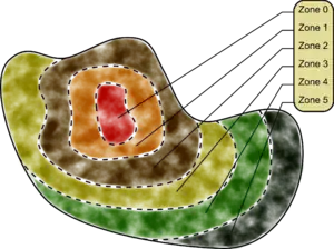 Zoning means dividing a certain piece of land into several zones, with the family house in the center. All of these have a function to the owner of the land. Although this generally creates a rather artificial vegetation pattern, it creates an environment that has benefits both for the owner of the land, as well as well as for nature (to some degree). A more serious issue of permaculture (namely the use of non-indigenous and sometimes domesticated species of fauna/flora) can be reduced with zoning however. This, by placing domesticated (and generally more efficient) species near the center/home, and using indigenous species in the zones further away from the center.