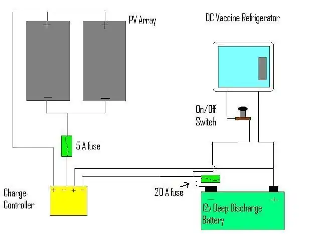 The two 12V Panels are wired in parallel, to keep the panel´s voltage about the same as the battery´s. On the negative side, a 5A fuse is conncected for saftey purposes. Should anyone accidently cut the wires so that it creates a circuit, the fuse will break as the current surpasses 5A. From there the wires connect to the charge controller. Then two wires leave from the charge controller to connect to the battery. Once again, a fuse is fastened to the end of the negative terminal of the battery. This is to ensure that anything that passes to or from the battery must first pass through a 20A fuse. It is important to size your fuses appropriately. If the fuse is undersized, it will blow to frequently, creating a hassle to maintain, and in the case of the refrigerator, could be dangerous to the internal temperature. Therefore, its ideal to size your fuse, just over your surge current, which for the fridge is 15 amps. That way, the fuse wont blow everytime the compressor kicks in, but it could still save someone's life in the case of an accident. From the battery, the wires flow to a switch, allowing for one to shut off flow from the battery to the fridge for maintanence or in an emergency. This is a simple, yet essential part of a system. Finally, the cables run from the switch to the back of the fridge.