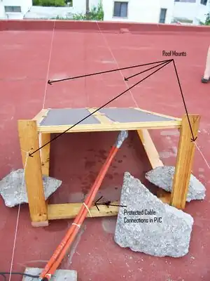 The mount is crafted out of wood. It was built by a local carpenter in Parras. It has hinges fastened to the bottom so that the panel's angles can be adjusted. However, as of now this systems mount is fixed at 25°. Future groups maintaining this system, may choose to create notches in the back supports of the mount so that the panels would be able to be adjusted seasonally. The mount is put on the highest roof at the hospital, and there are no obstructions such as trees or buildings that can interfere with the panels. However, because of high winds, it was essential that this mount was fastened to the roof. One way to this is to use tar to fasten the mount down tight. However, this mount was fastened down with 2 cables running from both the front and back of the mount that fasten to the edge of the roof. Additionally, 3 concrete blocks are laid across the bottom of the mount to help weigh it down.
