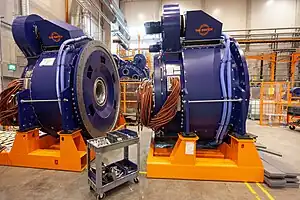 The magnet rotors are mounted on bearings, which turn on the shaft. The rear rotor is behind the stator, and enclosed within it. The front one is on the outside, fixed to the rear one by long studs which pass through a hole in the stator. The wind turbine rotor blades will be mounted on the same studs. They will turn the magnet rotors, and move the magnets past the coils. Magnetic flux passes from one rotor to the other through the stator. This moving magnetic flux is what produces the electric power.