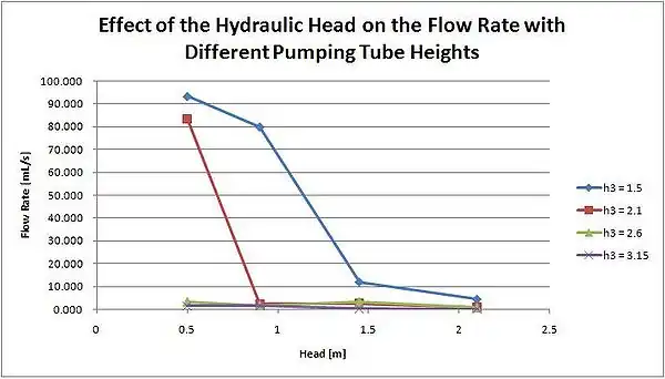 In this test, two variables were changed, the hydraulic head on the pump, and the height of the pumping tube.