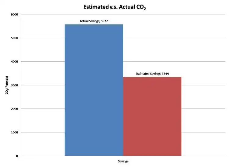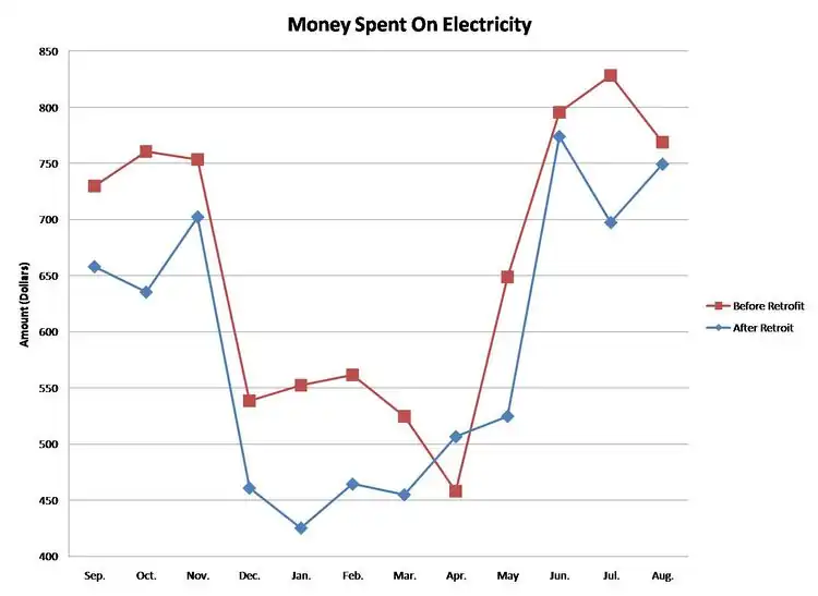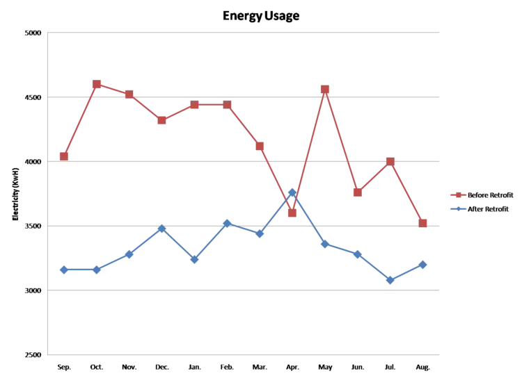 The retrofit was successful in the goals of conserving energy and saving money, but did not meet the estimated dollar savings originally set by RCEA at the completion of the Retrofit. The estimated savings was $1,072.42 per year. In the first full year (Aug. 2008- Aug.2009) the actual savings was $866.96. That is a difference of $205.46 in the first year. The actual energy savings did however exceed the estimated energy savings of 6,431 kwH/year. In the first full year (Aug. 2008-Aug. 2009) the actual savings was 9,960 kwH/year. This data shows that the price of electricity was most likely higher when RCEA was making estimations than it is currently because there was more energy saved then estimated but less money saved. All of the results are expressed in Table 1.