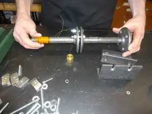 The purpose of this step is to form the barrel of recyclebot. The barrel will have a bearing end, a mouth, a juncture (thermal break), and a nozzle. The mouth of the barrel will be referred to as the front side of recyclebot; the opposite, solid surface will be the back side. The barrel will house the feed screw, which should retain free movement throughout the assembly process until the motor attaches to the feed screw; it is important to continually ascertain and adjust the positioning of all components during this step and the following steps to ensure this free movement.