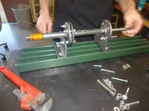 - (ii.) Insert a 1 ½" bolt into the open upper hole on the floor flange, from barrel side to bearing side. Repeat this with another 1 ½" bolt and the second open upper hole.