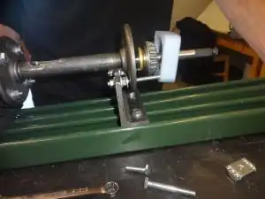 Before you begin this step, the barrel of recyclebot should be completely tightened onto the frame. The feed screw, when inserted into the barrel should freely move and should spin when rotated. The brass spacer used in this step is made by turning it on a lathe; this can be made at a local machinist shop. (See Photo 20)