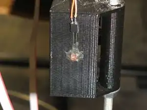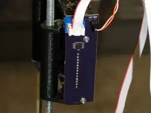 - Install the sensor in the printed shroud with two M3 x 12mm screws and washers. Connect the LED to the 1x2 pin header and plug the 6 conductor ribbon cable to the shrouded 2x3 pin header. Plug the other end of the ribbon cable into the icsp header on the controller board.Sensor in shroud.