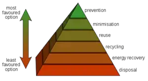 The slogan Reduce, reuse, repair and recycle is an approach to the waste hierarchy that seeks to be as ecologically appropriate as possible and maximize the value and use out of a resource. It is sometimes shortened to "reduce, reuse, recycle" and sometimes, a fifth 'R' is added, such as 'refuse', 'remanufacture', 'recover', 'restore', 'redesign', 'repurposing', 'rot' (compost), etc.[1]