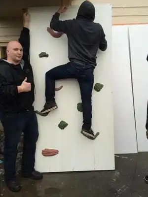 Team Gridiron put one section of the wall together to conduct a series of tests to see if everything was working properly. Each team member was able to climb up and stand on the holds proving that the wall can withstand a greater amount of weight than the kids. As you can see in Figure 1, the structure can withstand the weight of an adult.