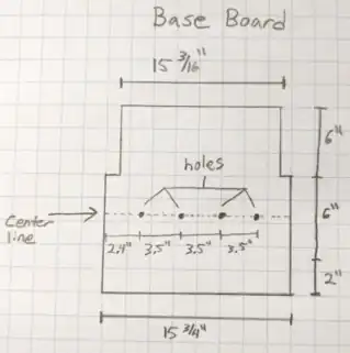 The finish line placement mechanism is constructed from wood, with a sturdy metal housing used for the gate portion. Begin by measuring the width of the metal box to be used as the gate housing. Cut a piece of ½" plywood that spans the width of the metal box to be used as a base, and extends 6" out of the back, and 2" out of the front. Draw a line across this board directly in the center of 6" metal housing, which is 9" from the back and 5" from the front. Drill 4 holes on the center line, starting at 2.4" from the side, then space each hole 3.5" from the previous hole, see Figure 5-12.