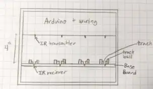 Construct a box to hold the Arduino, wiring, and LEDs which will be mounted above the base board. The box is to be positioned so that the infrared receiver and infrared transmitter are located within 4 inches of each other. Drill out 4 holes to mount the infrared transmitters located above the holes for the infrared receivers. Drill out 4 additional holes on the front face place of the box for the indicator LED's. Cut 8 14" long, ½" wide strips of ½" plywood to be used as track, cut 8 14" long, ¾" wide strips of ½" plywood to be used as track wall. See image Figure 5-13. Glue the track strips so that there is a ½" gap in between, with the hole for the infrared receiver positioned in the center of the ½" gap. Glue the track wall strips on the outside of each track strip to form the dual use track.