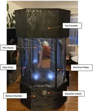 The students built the prototype at the University Cal Poly Humboldt makerspace. The goal was to create a small-scale exhibit using similar mechanical components to those used for the final design. Materials consisted of four PVC pipes, cardboard, duct tape, two 12-volt batteries, a small fan, hot glue, dry ice, saran wrap, and a bowl. The prototype had a bottom, top, and central chamber. Cardboard and duct tape were used for the construction of the second prototype. The bottom chamber was built in an octagonal shape. For the ceiling and the base of the chamber, four of the sides were 18 inches long and the other four were 12.7 inches long. The shorter sides all had outer angles of forty-five degrees. The walls were all 16.75 inches tall.