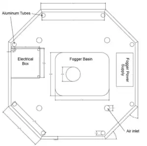 The bottom chamber of the exhibit contains the ultrasonic fogger, a basin filled with water for the fogger, and a compartment housing all the electrical workings. The figure below depicts the approximate layout of the bottom chamber as well as the geometry of both the top and bottom chambers. The ultrasonic fogger creates mist which is contained within a sealed basin. A 4inch diameter tube connects the top of the basin and the central chamber of the exhibit where the vortex is formed. There are ¼ inch holes drilled in the tube which allow air to be pulled through the tube and into the central chamber along with the pooling mist. There are four 1.5inch diameter air inlets in the bottom face of the chamber to allow outside air to flow into the bottom chamber.