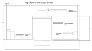 The top chamber of the exhibit contains the inline ventilation fan, a 6in to 4in tapered ventilation duct, and the open top sides of the aluminum tubes. The fan rests in a 7.7in diameter hole in the center of the bottom face of the chamber. The tapered ventilation duct rests directly on top of the outflow side of the fan. When the fan is turned on it pulls air from the central chamber creating an updraft. The exhaust of the fan is split by the tapered duct. Some of the exhaust is directed through the duct and out of the top chamber of the exhibit. The rest of the exhaust is directed into the sealed top chamber. The redirected airflow then travels through the open top sides of the aluminum tubes.