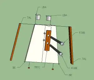 This is the bench leg. Glue and nail/clamp TAL to BE. Glue and nail TBCC to the center of BE. Use this diagram for referencing pilot holes for lag-bolts and angle cuts required for both BE and TAL parts. Once TBCC is mounted, drill corresponding pilot holes for the lag-bolts (R38B). Place either homemade or store bought protective pads (P) two inches inward from the ends of BE.