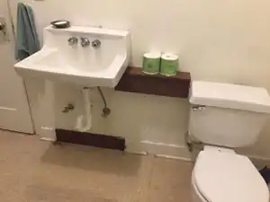 Figure 1 shows what the restroom looked like before the remodeling process began. The toilet to sink greywater system shown in figure 2 was designed to save the amount of water used when washing your hands after using the restroom. The design uses polyvinyl chloride (PVC) piping, shown in figure 2 and figure 3, to reroute the water's drainage onto the overflow tube so that the used soapy water flows directly into the toilet bowl. The design works by attaching the toilet tank's overflow fill tube shown in figure 4 with the sink's hot water supply line using vinyl tubing shown in figure 5. The sink's water runs approximately 40 seconds when the toilet is flushed giving double the amount of time than the recommended 20 seconds according to the Centers for Disease Control and Prevention (CDC). What makes this unique to the standard toilet to sink combinations is that the sink and toilet are placed like any ordinary bathroom would have them rather than replacing the top of the tank with a sink.