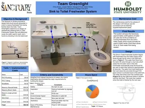 The toilet to sink greywater system is a system implemented by Team Greenlight in Fall 2016 in the men's bathroom for their client, the Sanctuary located in Arcata, California. Team Greenlight includes Chris Alvaro, Jocelyn Barber, Margaret Koval, and Gilbert Ordaz. The Sanctuary is a non-profit organization that promotes green technology, art, community involvement and sustainable living by the reuse of every day resources and items. The Sanctuary's objective was to remodel a bathroom that would reduce freshwater usage while at the same time inspiring the user to continue reducing their own personal freshwater usage outside of the Sanctuary.