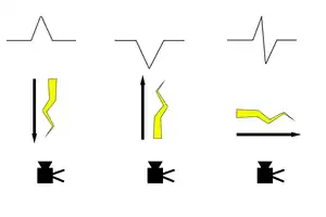 The easy explanation is that each pair of conductive electrodes applied to a patient's skin creates a "lead" that measures the difference in electrical potential between the positive and negative electrode of that lead. For EMTs and paramedics, think of the lead as a camera mounted on the positive electrode looking at the negative electrode. Any electrical current travelling towards the camera is shown as a positive deflection while a current travelling away from the camera is seen as negative. Electrical currents travelling perpendicular to the camera are seen as positive deflections (they are moving towards the camera) followed by negative deflections (they are now moving away from the camera (see Fig. 3 for a visual representation of this). The electrodes are placed on the patient's chest and extremities in a way such that the heart is in the "view" of the "cameras"; this allows the lead to view the basic pathway of electricity through the heart from a single angle. As each lead is computed in a different way, each lead therefore looks slightly different as it "looks" at a different area of the heart (this will not be discussed on this page, as it is part of the paramedic curriculum). The different parts of the waveform will be discussed in the next but we will not be going into any significant depth as this page is primarily made for the EMT knowledge skillset.