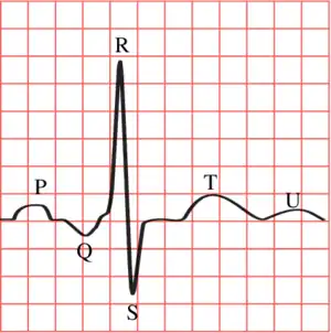 QRS complex: The QRS complex is indicative of ventricular depolarization (when the ventricles receive the impulse to beat) and is made up of three waves, the Q wave, R wave, and S wave. These waves will not fully be discussed in this page as they are used during more in depth analysis of the EKG than an EMT would need to know. The Q wave is simply the first negative deflection after the P wave while the R wave is the first positive deflection after the Q wave. The S wave is the first negative deflection after the R wave. Keep in mind that "deflection" refers to passing the isoelectric line.