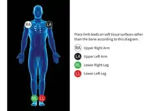 The 4 lead is a staple of ALS monitoring. The 4 leads used are the limb leads which are placed on the right and left arms and legs. Alternate placement of the leads such as torso placement is possible and will result in less artefact but less specificity. The placement of the leads is simple and uses color coded wires for the ease of memorization (e.g. white is on the right, smoke/black over fire/red, and sky/white over grass/green) and 4 lead cables often come with two letters found on the head of each cable that denote where the cable should be placed (e.g. RA, LA, RL, LL). Leads placed distally will produce a more clinically significant picture of the patient's cardiac status when a 12 lead is performed but can lead to increased artefact. Each lead should be placed directly on the patient's skin with as much contact as possible and not over a overly bony or muscular area. See Fig. 1 for an example of extremity placement of the limb leads.