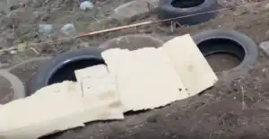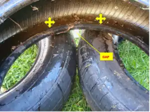 Place the first row of tires neatly in a line and use a level to flatten them as evenly as possible. Place cardboard inside tire to cover the bottom hole. This prevents dirt from spilling out through the bottom as it is filled. The photo to the left demonstrates measuring the cardboard to be cut before it is inserted into the tire.