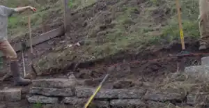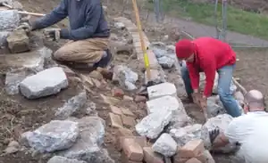 Create a foundation layer by digging out all loose dirt, tamping firm the earth that your first layer of urbanite will be placed on, and level it.