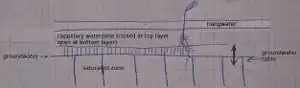 - Hanging water: The portion above the capillary zone contains water that, during seepage, kept hanging in the fine pores or got stuck in the colloidal particles. (sandy soils have little or no hanging water, clayish and loamy soils have a lot therof)