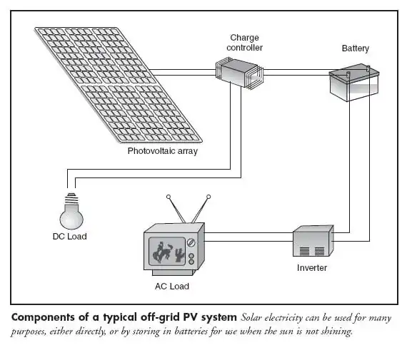 While in developed countries there has been a rapid increase in grid connected PV systems, in developing countries the majority of PV systems are stand-alone off-grid systems. The off-grid systems can be used to drive a load directly; water pumping is a good example - water is pumped during the hours of sunlight and stored for use; or a battery can be used to store power for use for lighting during the evening. If a battery charging system is used then electronic control apparatus will be needed to monitor the system. All the components other than the PV module are referred to as the balance-of-system (BOS) components. The figure below shows a typical configurations for an off-grid PV system. Such systems can often be bought as kits and installed by semi-skilled labour.