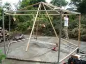 After looking at way too many of other people's roof designs and even building a miniature model I decided on my own creation. I wanted a roof that was all one piece, hence seamless(=rainproof) and it had to be tight fitting so rain wouldn't puddle. This was achieved by cutting out a 20' diameter circle and punching a hole in the very center for the bolt of the apex bracket to fit into. Then I wrestled the beast onto the structure and inserted the bolt into the hole I punched. I then proceeded to staple (use stainless steel staples) the tarp to the vertices. I would pull the tarp tight against the bolt and away from the last vertex to eliminate lateral and vertical slack. I continued around the whole structure, in essence making a cone, until I reached the starting point and had an extra fold of tarp (from all the slack being pulled out elsewhere). I folded this over tightly and marked it so I would know where the fold was when I took it back off to tape (inside and out) the fold closed. I then cut out a hole for my skylight (~3' diam hexagon) and pulled the tarp back off. The fold was taped as well as the border of the skylight with Gorilla tape (like duct tape but much stronger). I also put in 12 grommets along the circumference of the skylight to further tighten the roof cover with rope once it was stapled on. Again I wrestled the tarp back on (it truly is wrestling), stapling it tightly in place. Then I installed hooks on the top side of the rafters and used rope threaded through the grommets and the hooks to tighten the tarp upwards against the eves. Voilá! Done… with the roof that is. I actually also grommeted each vertex pt. on the eve and tightened down in the same manner as the skylight opening, hooks and all.