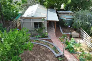 The house has a low water garden in the front and the Sanci permaculture garden for producing food and shade in the rear.