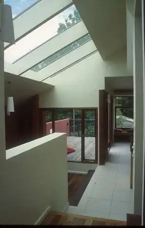 A solar chimney is created by a venturi peak with a window above the roofline overhead the upstairs stairwell. Hot air rises and leaves the house when this window is open. Cross-flow ventilation is achieved by the placement of wide-opening windows all around the house. When opened in the evening, these also allow cool air to be quickly drawn into the house when warm air is venting up and exhausted through the solar chimney.
