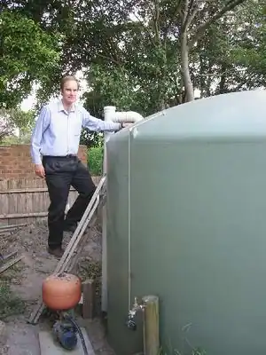 - Water is provided by rainwater tanks (2 x 4500 and 13,500 litre) giving us a total of 22,500 litres of storage for rainwater collected from our roof. First flush diverters remove impurities in the water that first comes off the roof when it starts raining. A Davey electric pump supplies rainwater for all uses in the house. Tip: Go for a more powerful pump rather than one that just meets your requirements.