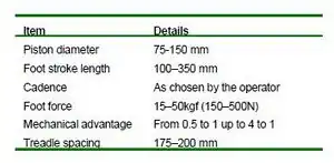 Figure 8 below, taken from Kay, 2000,[40]identifies most of the desirable characteristics for a treadle pump. Since the operator's position on the treadles can vary, this is not explicitly defined in the table. Other desirable characteristics can include weight, or lack thereof: a heavy base and frame can be left alone as they are more difficult to steal, while a wooden or bamboo frame are light and portable, so can be used in several areas of one farmer's field, or can be shared by neighbouring farmers to irrigate the collective land.
