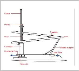 In the past, these pumps were hand-operated and quite inefficient, as the effort required to lift small amounts of water was significant. Using the larger muscles in one's legs and two pistons has greatly increased the efficacy of this machine. The treadles are joined, either by a rope passing over a pulley, a chain and rocker system, or a centre shaft.[10] This connects the two pistons as well and associates the upward motion of one treadle/piston with the downward motion of the other.