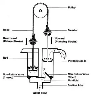 A treadle pump is a basic cylinder-based pump: it comprises a cylinder fitted with a piston and some means of pushing the piston up and down.[8]A pipe connects the water source to the pump, where a non-return valve is fitted to allow water to flow in and prevent it from flowing out. The piston itself must have a snug fit inside the cylinder in order to create a vacuum to draw water in. The piston itself contains a similar valve such that, when it is forced downward by the treadle, water flows through the piston from the space below to the space above it. The opposite then occurs when the piston is lifted: the valve closes, forcing the water above the piston to the outlet all the while drawing in water from below. Various types of non-return valves are used, including rubber flaps, swinging gates and poppet valves.[9] An illustrated version of this is shown in Figure 2, and an animated version can be found at.