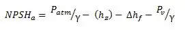 P_atm = atmospheric (or absolute) pressure; γ = specific weight of the fluid; h_z = vertical distance (elevation) between the surface of the water and the pump; ∆h_f = head loss due to major and minor losses in the suction pipe, valves and fittings; P_v = vapour pressure of the fluid; and