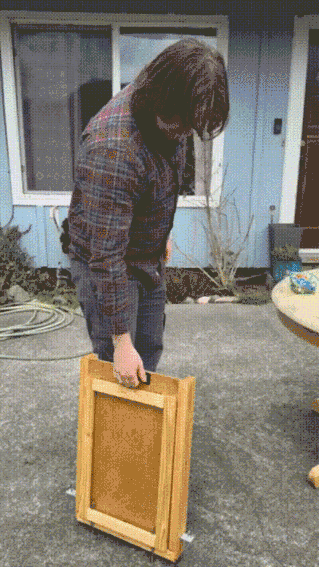 With the completion of the display frame, a prop mechanism was constructed with 1x2 inch cedar planks to create a rectangular perimeter. The prop mechanism was then screwed into the back of the display frame using metal hinges that would allow it swing open and allow the board to stand.