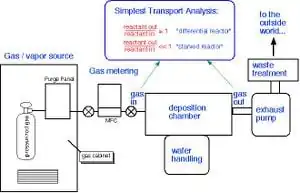Precursor material enters the chamber by fluid force flow. Inert gas follows flows along streamlines by diffusion within the chamber. Deposition reactions are driven by concentration gradient within the reaction chamber. Ionized material diffuse through the boundary layers of the substrate and the first film is build. After initial deposition occur molecular byproducts are formed and de-absorption occurs as the excess material and byproducts flows are sucked out of the chamber.[5]