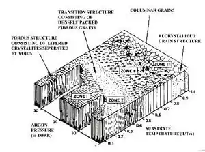 This model summarizes the relationship between the substrate temperature, kinetic energy of the ions and the deposition rate. This illustrates the relationship between the coating morphology and the deposition temperature and the pressure