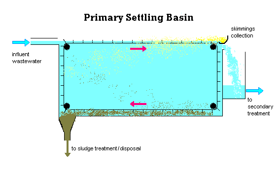 The next part is the Primary settling basins. This is where the water flows slowly for several hours, so that the solid matter can settle out. The primary settling basins are either circular or rectangular. Either type of settling basin has to have some type of scraper at the bottom, so that it can collect the settled sludge and direct it to a pit from which it can be pumped to get more treatment. The basin also needs skimmers at the surface, to collect the material that floats to the top.