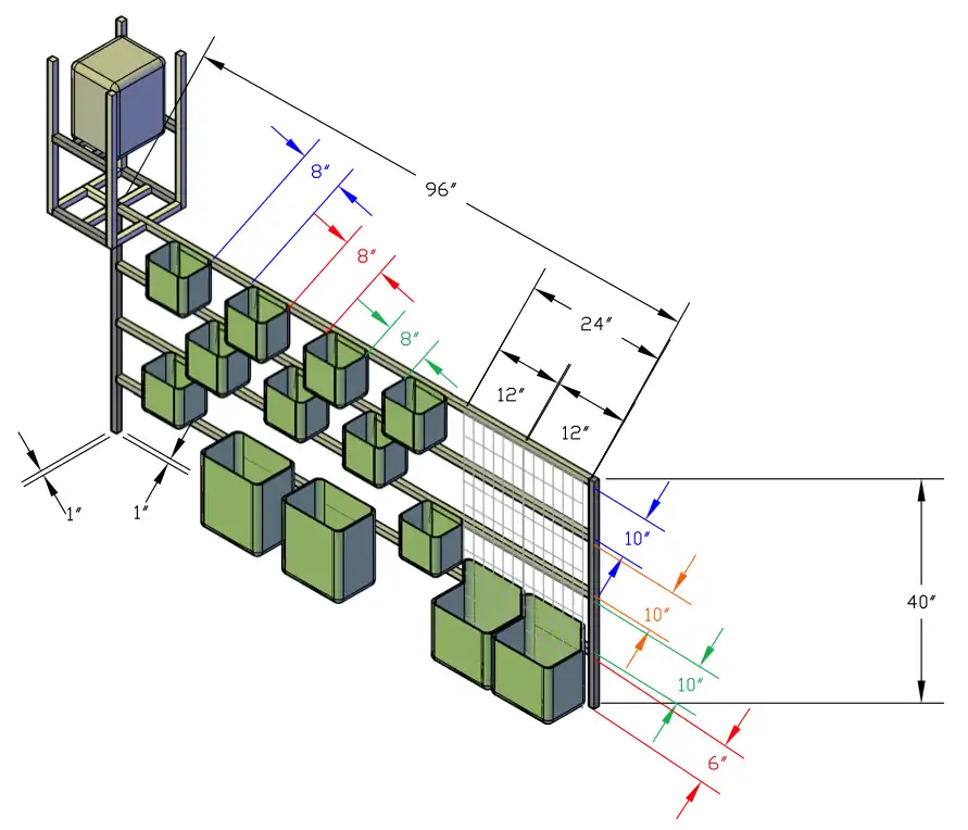 The following sections contain the specifications and details for one 8-foot section of the edible railing structure. When applied to the barge, this 8-foot template will be repeated in fifteen sections to cover the 140-foot perimeter. These sections include a description of the materials, costs, and implementation instructions.