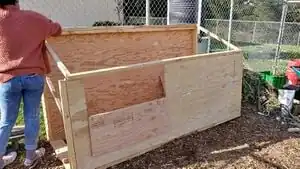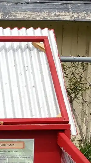 Although functional and sized well, the large corrugated metal roof was not ideal for this project. The roof requires too much effort to lift, both because it is so long and because it is heavy. In the future, the lid should be made from two shorter sections (one over each bin), and should be made of a relatively light material. Instead of using corrugated metal, a corrugated plastic roof would make it a lot lighter although may be more expensive to buy brand new. The wire mesh edges proved to be really sharp so if replaced, it is recommended to fold the sharp edges toward the inner walling of the compost. This is to ensure that the sharp edges are pointed inwards to prevent potential harm.