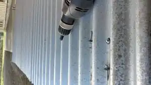 Attachment of corrugated roof to wood frame. Gasketed metal screws were used to attach the corrugated roof to the frame. Gasketed screws would ensure that no unwanted moisture would seep into the pile through the holes they created in the roof.