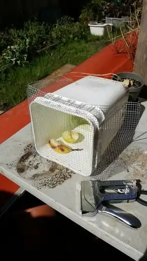 Fig. 3: 1/4" hardware cloth was selected to line the bins and keep rats out of the compost. The pest-resistant quality of the design was tested by placing fruit in a bucket, closing it with hardware cloth, and allowing it to sit outside for two days. Control fruit was left outside of the bucket, and it dissapeared, while the fruit in side the bucket remained. It was a success!