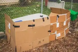 Fig 1: The first aspect tested was the area (size and location) in the garden the composter would occupy. This was accomplished using cardboard and duct tape. After the frame was built, the doors were modeled from cardboard to test for accessibility. Fold-down doors were selected.