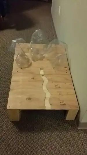 The foundation is made of 2 by 4 inches pine wood cut into varied lengths as seen on the AutoCAD drawing in Figure-3. It holds a 3 by 2 feet platform that is cut into two pieces to accommodate for the slope so that the water may flow smoothly down the watershed. The wood connecting the platform was added later for more support. Once the foundation was built, the river was etch into the wood.