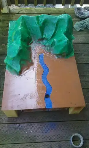 The testing of the watershed model went well, but we have found some minor flaws as to the water being poured onto the mountains. We realized that if the students were to pour too fast, it would overflow the rivers and tributaries and push the water out to the sides. This is something we don't want as it can get the classroom messy, especially if there is food dye in the water. We only want it to go to one destination, which is the tray. Overall, the model works very well and all we need to do is to fix this minor flaw and our model is ready to go. The final results were almost perfect, and we determined that there should be minor changes for the interactive model to perform effectively and meet the criteria.