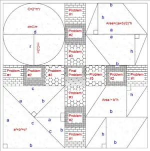 After showing our clients the alternative prototypes, we decided to conglomerate the separate solutions into one final design, naming it "The Fibogeometry".The team also decided to paint the final design, and create it in a way that is easily replicable through a series of stencils. The final design has three main rectangles which contain Fibonacci spirals. The middle rectangle is filled with various geometric shapes, and the corresponding equations to solve each. The two opposite rectangles have been left relatively blank, to allow students to experiment with shapes creatively through means of drawing with chalk on the concrete.