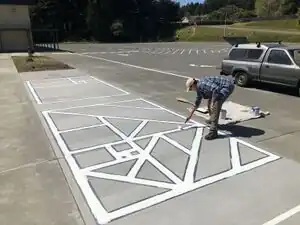 Using a small roller or spray machine evenly apply the white concrete paint to the areas that have been prepped with tape.