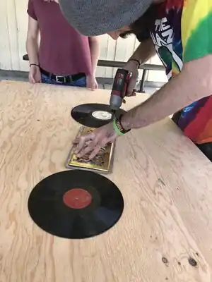 Plan out design of violin for side panels. Team Strange used old records, bottle caps, brass air vents, license plates, and recycled wood to create the violin.
