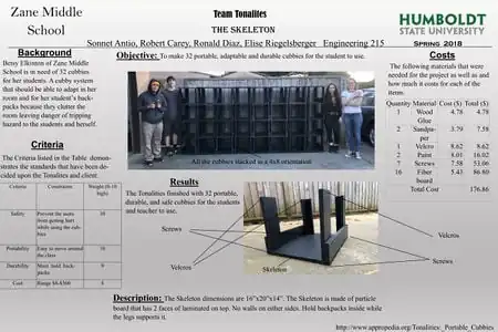 The objective of this project was to develop a cost-effective cubby system that will be safe and portable for the teacher and students using it. These cubbies should be constructed in a cost effective way, using up-cycled material to accommodate the criteria. The design will ensure the safety of the middle school students who will be using it, while maintaining a light and portable storage system.